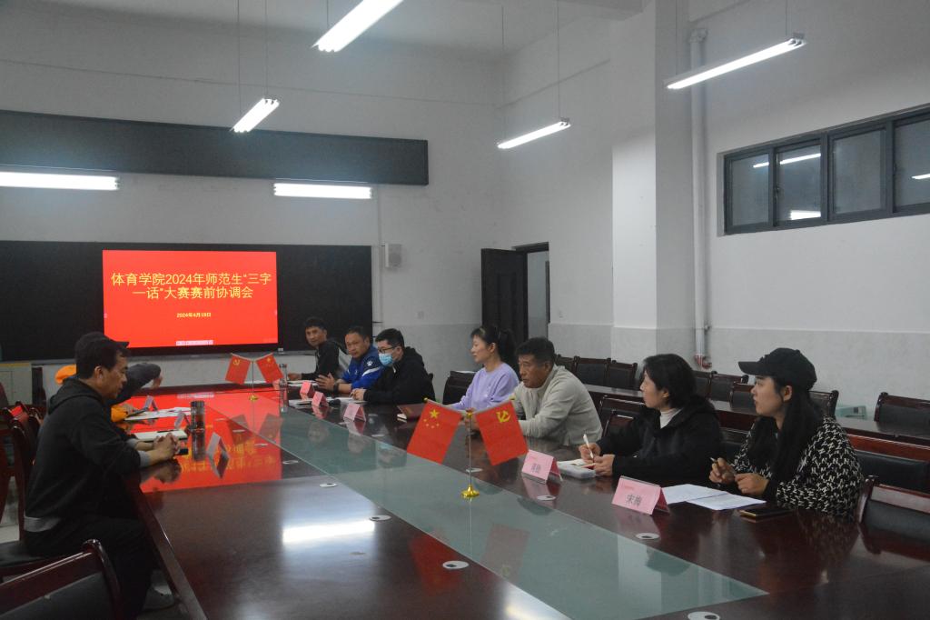 为了2024年“三字一话”大赛的顺利进行,体育学院于2024年4月19日中午12:30分在体育学院A104会议室召开体育学院2024年师范生“三字一话”大赛赛前协调会。参加此次会议的领导有体育学院院长白明、党委副书记王德玉、副院长陈芳芳、团委书记胡杰、体育教育教研室主任徐光辉、副主任宋梅,以及评委老师金国文、张炳祥、李茹、刘娟、蒋励。