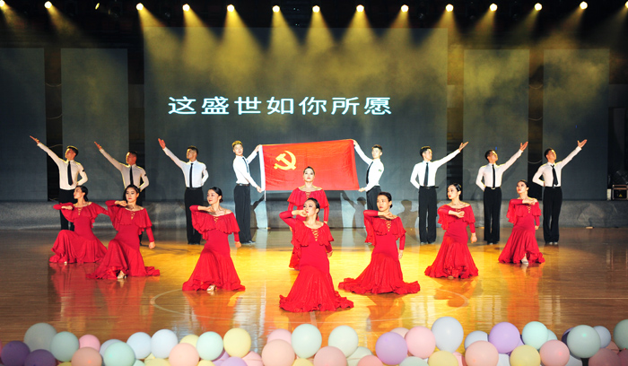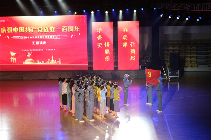 为庆祝中国共产党成立100周年,体育学院师生结合专业特点,编排了武术《热血华章》、舞蹈《初心》、健美操《党旗下的青春》等12个节目,引导师生学习党的光辉历史、感悟党的初心使命、传承党的红色基因,厚植爱党、爱国、爱社会主义的情感。在演出筹备的过程中,师生将作品创编的“舞台”变身党史学习教育的“讲台”,让党史学习教育活起来,让红色基因亮起来。