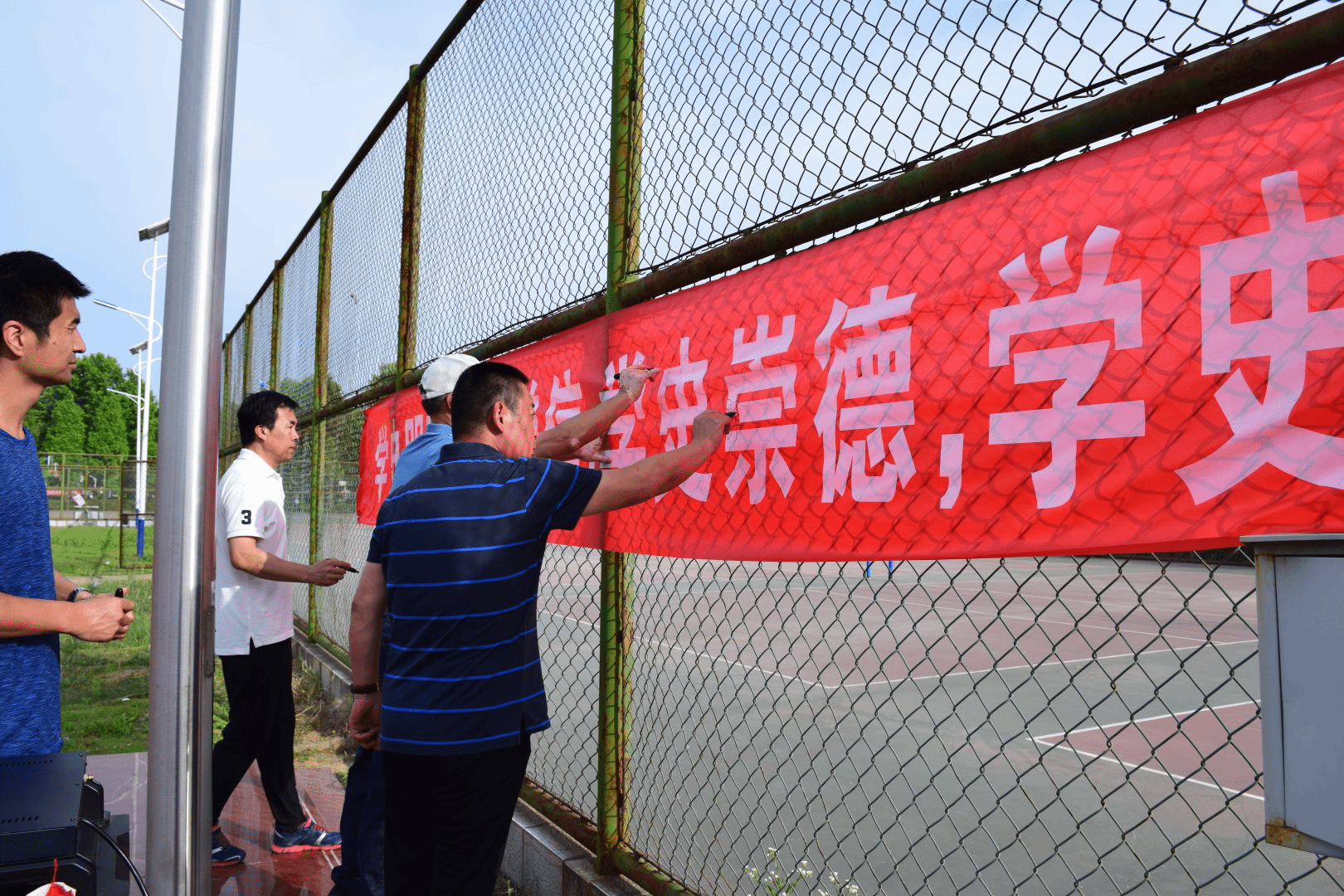 第一项:国旗护卫队出旗,在全体同学的注目下国旗护卫队迈着整齐有力的步伐走向国旗台。第二项:奏国歌升国旗,伴随着义勇军进行曲,国旗缓缓上升,全体学生行注目礼。第三项:由宋红军书记上党课,他介绍从1921年中国共产党成立后,中国人民在谋取民族独立,人民解放和国家富强的斗争就有了主心骨;为了实现中华民族伟大复兴的历史使命,我们党初心不改,矢志不渝,攻克了一个又一个的难关,创造了一个又一个奇迹;最后他给全体学生提出要求,让学生从此刻做起,做一个学党史,知党恩的当代大学生!第四项:全体师生在横幅上签名。