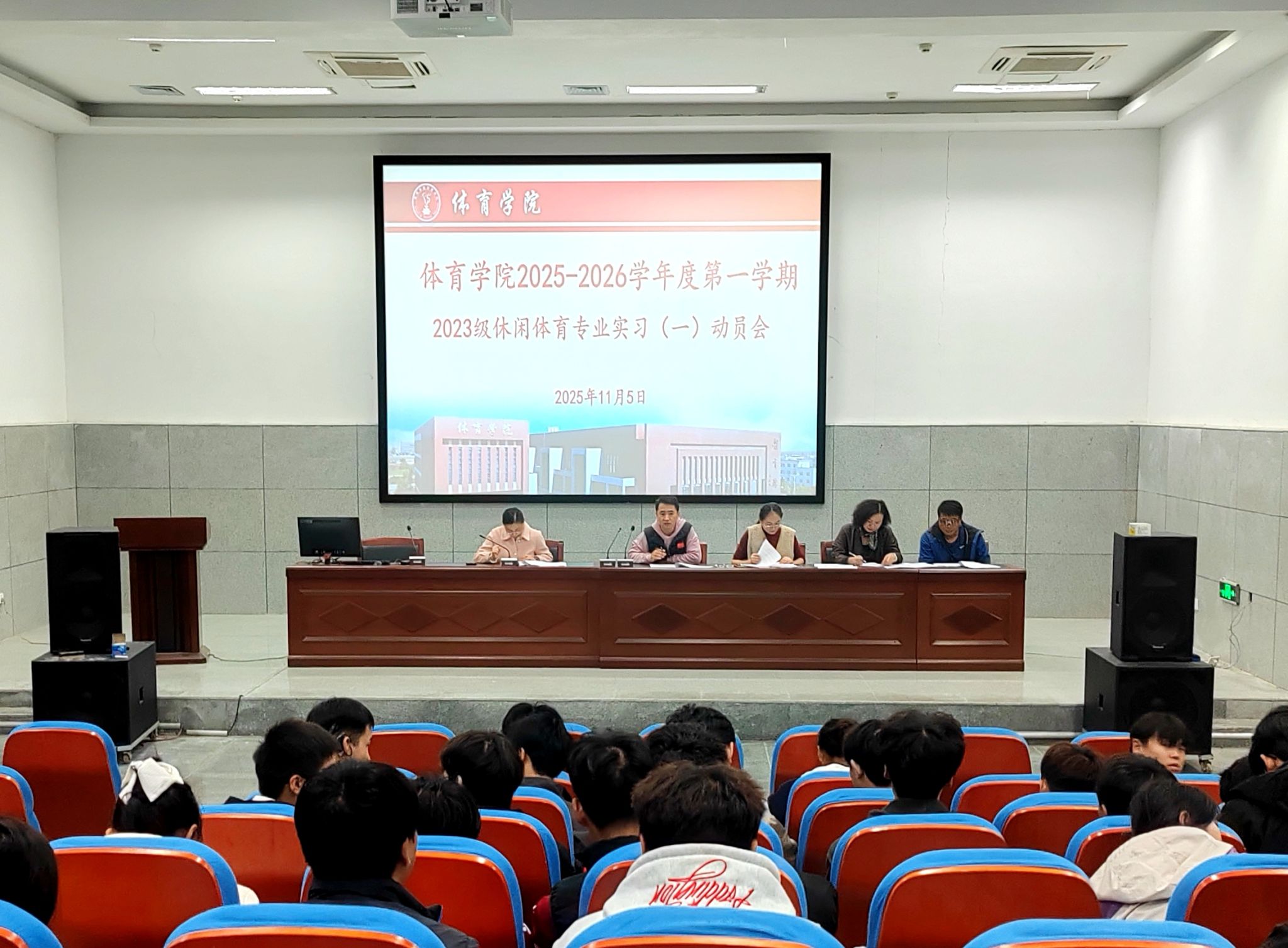 为切实落实人才培养方案,强化学生专业实践能力,2025年11月5日,休闲体育教研室在体育馆报告厅召开了2023级休闲体育专业实习(一)动员大会。休闲体育教研室主任刘明龙、休闲体育专业负责人张开媛、教研室副主任汤盈、见习指导教师张炳祥、刘娟和王俊及2023级休闲体育专业学生参加此次动员大会,会议由刘明龙主持。