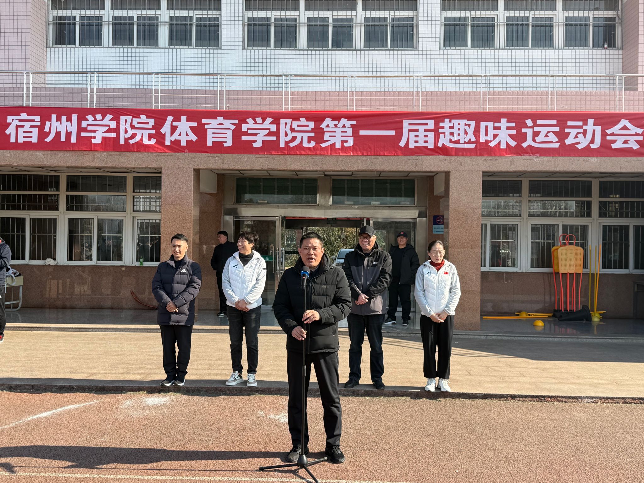 2025年12月3日中午12:30,体育学院首届趣味运动会在宿州学院教育园区田径场顺利举行,体育学院党委书记李高,党委副书记、院长白明,副院长陈芳芳,休闲体育教研室主任刘明龙,休闲体育专业负责人张开媛,各班级辅导员以及休闲体育教研室全体教师出席了本次活动。